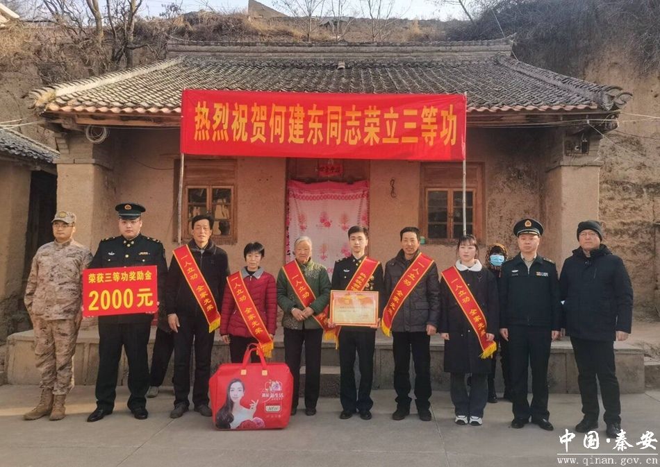 在新春佳节即将来临之际,为了进一步增强军人尊崇感、军属荣誉感,营造“一人参军、全家光荣”的浓厚氛围,激励广大官兵投身军营、安心服役,大力弘扬拥军优属光荣传统,近日,秦安县人武部、秦安县退役军人事务局联合火箭军某部队,会同兴国、郭嘉、魏店、莲花等镇人武部、退役军人服务站深入到兴国镇映南社区、魏店镇孙阴洼村、郭嘉镇暖泉村、莲花镇冯沟村,为荣立三等功现役军人李亚明、何建东、邵毅刚、冯杰的家庭送上了三等功喜报,让军人家属共享荣耀和喜悦。