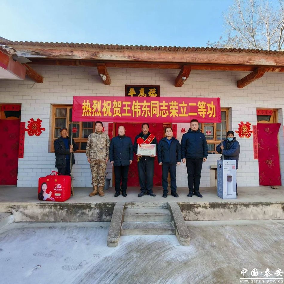 1月18日,县人民武装部、县退役军人事务局慰问组到千户镇何吕村右树组,为现役军人王伟东家属送去二等功喜报,让军人军属共享荣光。