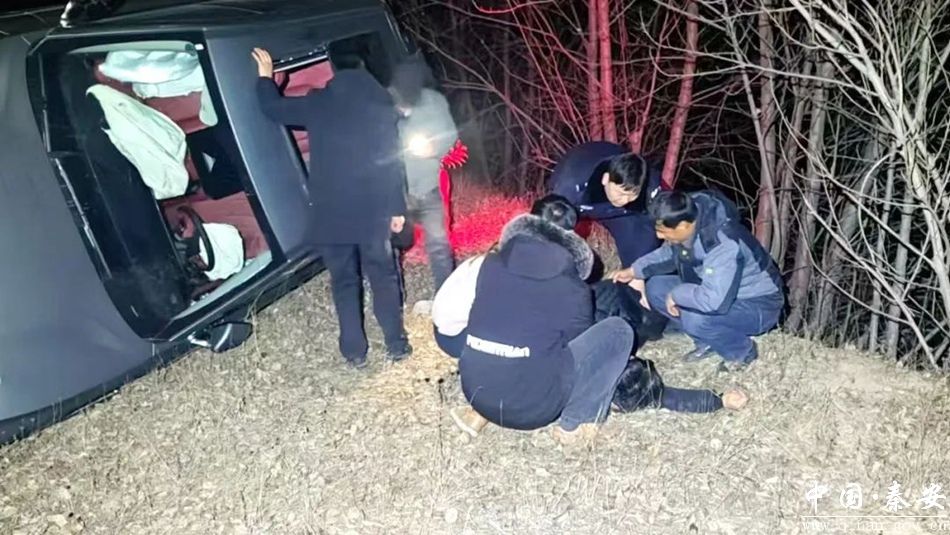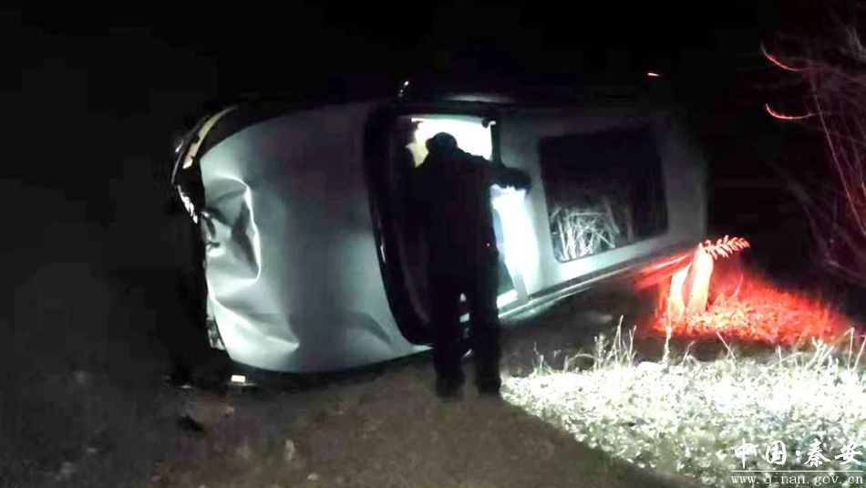 接警后,民警立即赶赴现场,发现有一车辆侧翻在路面,车体受损严重,车内有人员被困。经民警上前查看被困人员情况,发现被困人员因车体变形卡在车内无法动弹,遂民警果断开展现场救援工作,在夜间光线差、气温低等不利因素下,经民警半小时的艰难努力后,最终成功救出被困人员。