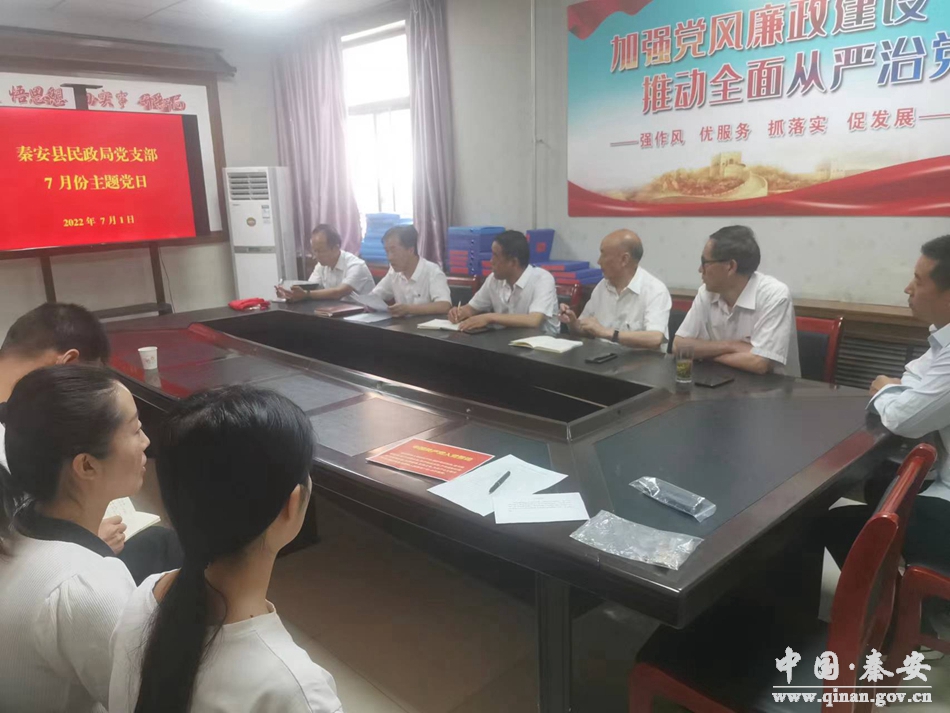 7月1日,在中国共产党成立101周年之际,秦安县民政局党支部开展“喜迎二十大,奋进新征程,建功新时代”七一主题党日活动,支部全体党员参加活动。