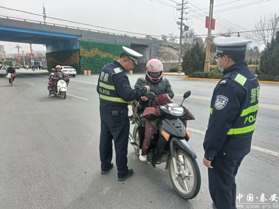 近日,秦安县公安局交警大队结合城市环境秩序整治,优化警力部署,加大道路管控力度,集中整治摩托车电动车不戴头盔、驾驶人不系安全带交通违法行为,持续推进“一盔一带”安全守护行动,织密事故防控网。