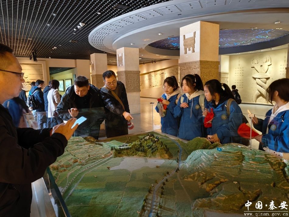 午后,师生一行走进天水古城,漫步青砖黛瓦的明清街巷,触摸“陇上江南”的历史肌理。在民俗文化展厅,雕漆、皮影、木雕等非遗技艺令学生驻足流连;步入天水市博物馆文物陈列馆,从大地湾彩陶到青铜器铭文,从汉简典籍到丝路遗珍,跨越千年的文物无声讲述着陇原大地的文明交融。历史教研组长伏建林现场教学:“天水是中华文明的重要发祥地,也是丝绸之路的必经节点,这里的历史就是我们理解‘多元一体’中华文明的最好教材。”