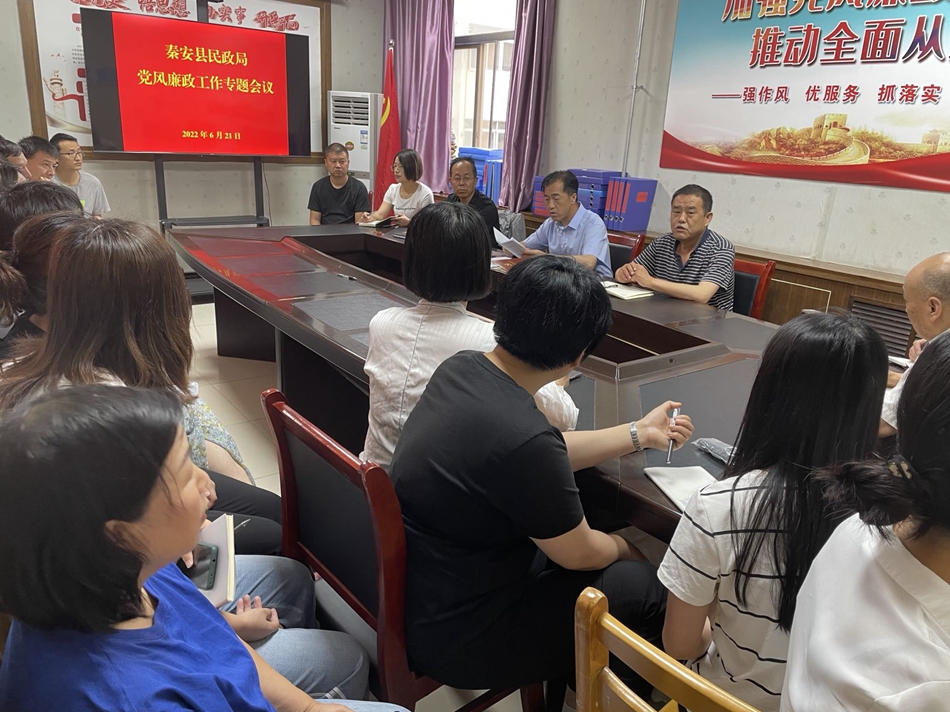 6月21日,秦安县民政局召开党风廉政专题工作会议,总结上半年局党组落实全面从严治党主体责任、推进党风廉政建设工作,研究部署下半年党风廉政重点工作。全体干部职工参加会议。