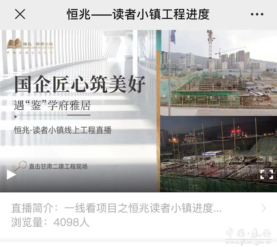 6月10日,甘肃恒兆实业有限公司联合甘肃秦融文化有限公司开展了一场网络直播,通过一台高端超清导播台、两台摄像机、一架无人机拍摄采访,全方位多角度直播了恒兆·读者小镇施工进度。共计4000多人观看了直播。