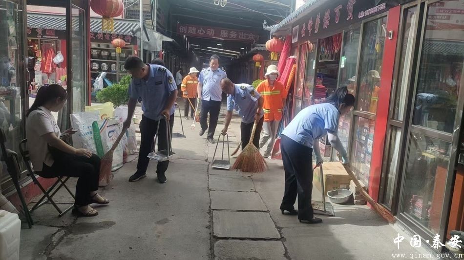 整治环境卫生,提升市场颜值。全员出动对市场内公共区域进行全面清扫,加强对市场内卫生保洁人员日常工作的监督管理,增加市场卫生清扫频次,做到垃圾日产日清。积极宣传“门前三包”责任,督促市场内商铺及摊贩及时清理日常生产垃圾,同时清洁商铺及摊位卫生死角和杂物,打造干净整洁的市场环境。共计发放宣传资料1100余份,清理卫生死角80余处,并对排污系统进行了全面维护,同时落实商户“门前三包”责任,有效提升了市场的整体颜值。