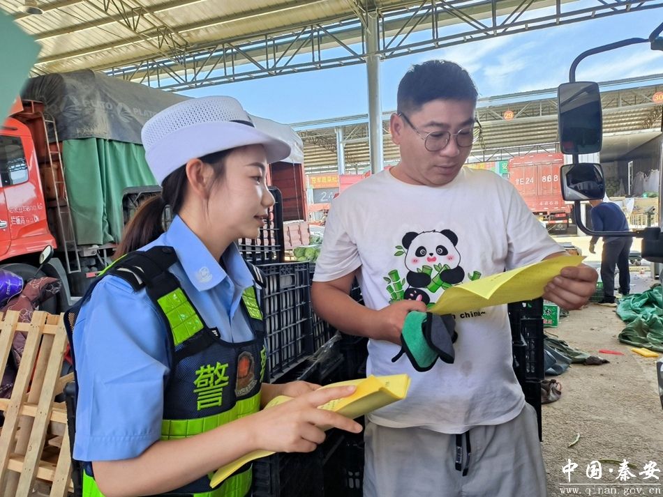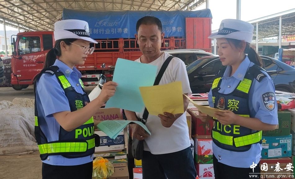 近日,秦安县公安局交警大队宣传民辅警走进辖区农贸市场,对正在销售农作物的农户及来往的群众开展交通安全宣传,把交通安全装进群众的“菜篮子”。