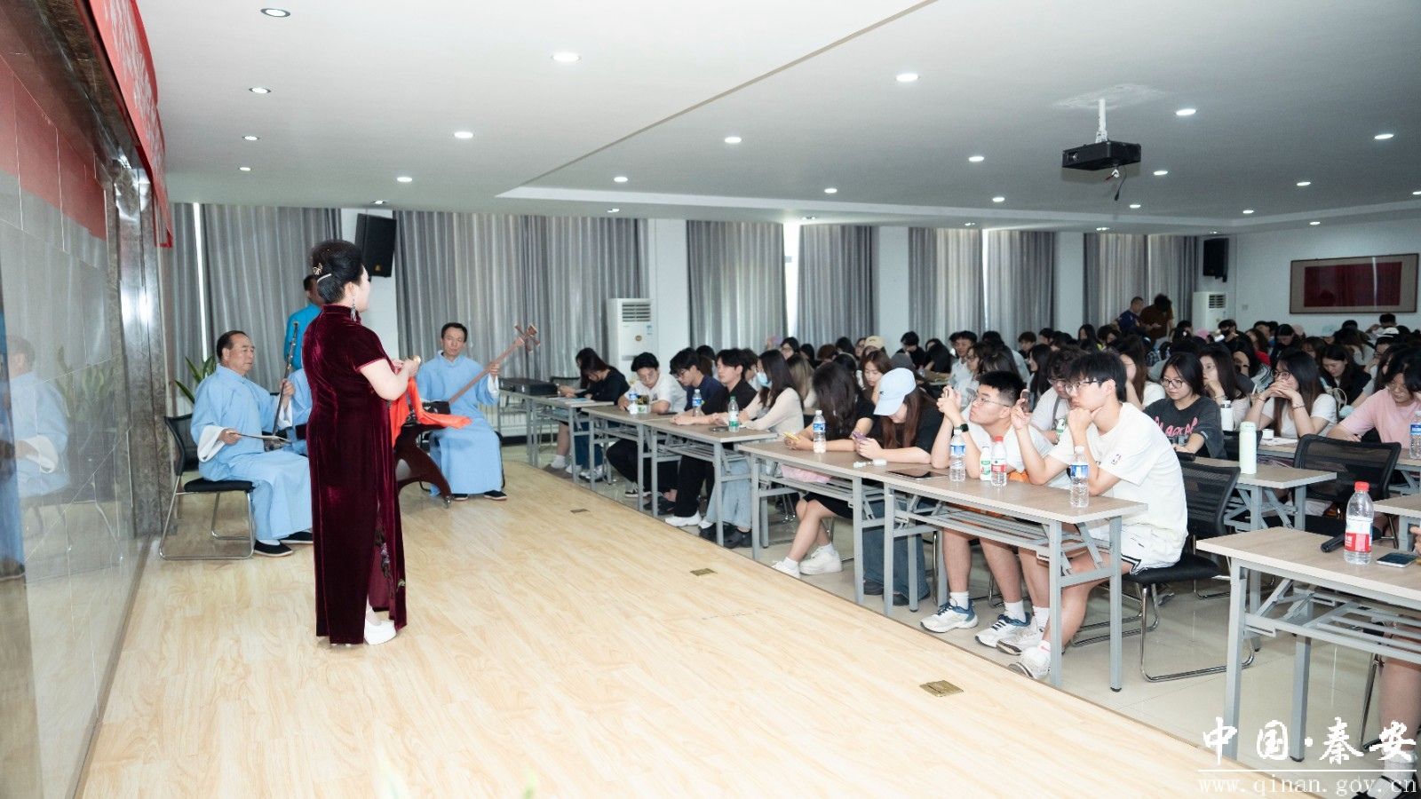 演出形式丰富多样,既有蔡爱琴、张天喜、侯玉琴联袂演绎的《青山绿水展笑颜》,其明快旋律展现了城乡山清水秀,百业俱兴的时代风貌。也有侯玉琴领衔的秦安小曲民歌联唱《放风筝》等,活泼生动,充满乡土气息。红色题材曲目《红船曙光》由蔡爱琴倾情献唱,节目创新性地将传统古曲与红色文化相融合,通过独特的曲艺艺术表现形式,生动诠释了红船精神的深刻内涵,赢得了现场二百多师生经久不息的掌声。杨效田、孙多成、安永昌等资深乐师组成的伴奏团队默契配合,三弦、扬琴、摔子等特色乐器交织,为整场演出奠定了醇正浓郁的音乐底色。
