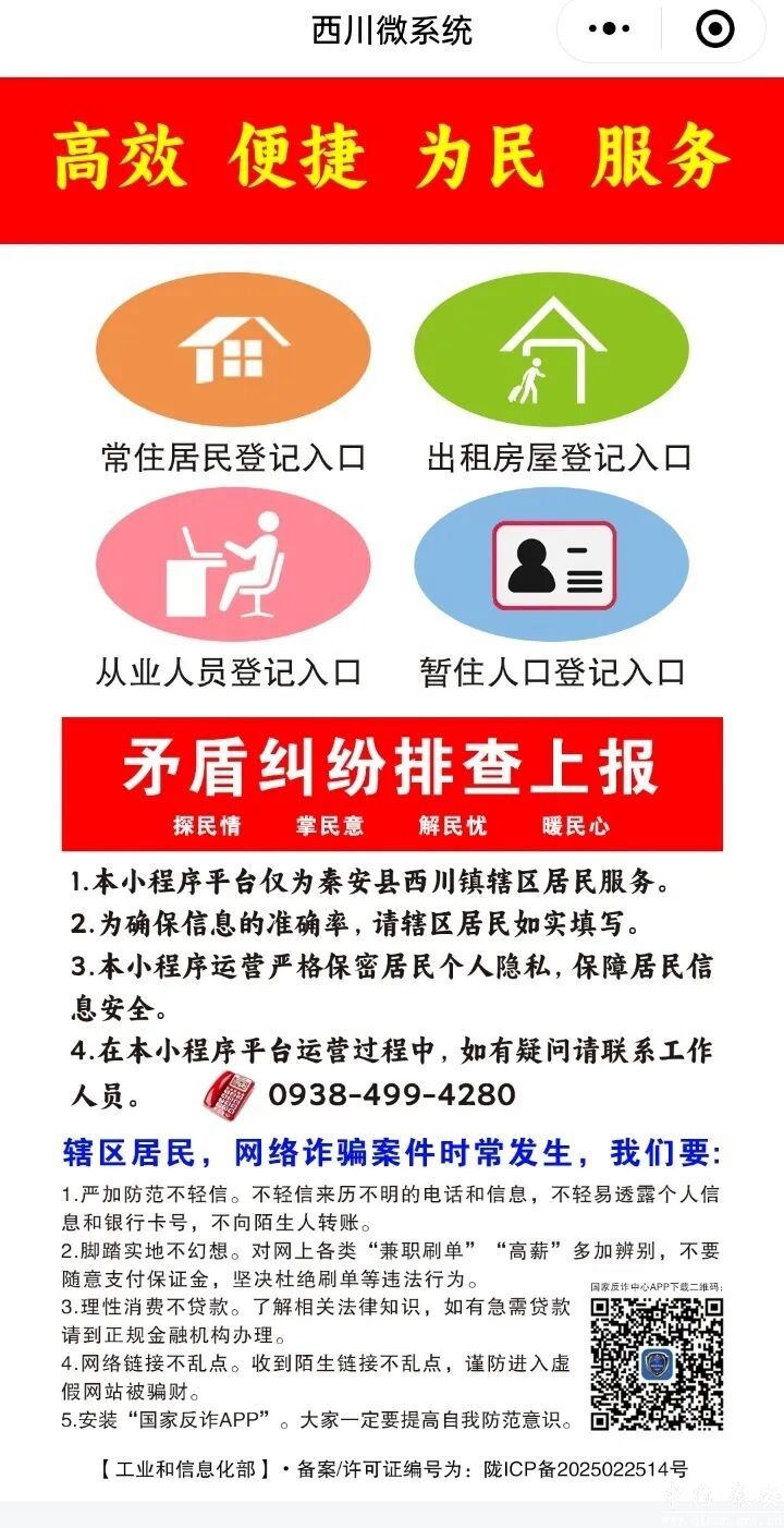 在功能模块设计上,“西川微系统”涵盖六大核心功能:常住人口信息登记核对,出租房屋及暂住、流动人口的自主登记和注销,辖区内政府机关、企事业单位及从业人员的信息管理,矛盾纠纷线索的实时提交,“国家反诈中心”APP的宣传推广与安装指导。群众通过手机指尖操作,即可完成多项原来需线下办理的事务,极大提升了办事效率与体验感。该系统的投入使用,是基层公安机关持续深化现代警务运行模式、创新“互联网+警务”机制、践行新时代“枫桥经验”的重要举措,也为基层社会治理注入智慧动能。