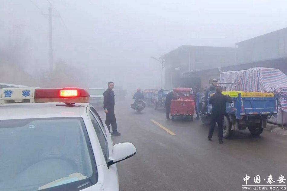 针对大雾天气能见度低、车辆易拥堵滞留、果农早出晚归出行集中的特点,秦安县公安局千户派出所采取“流动巡控+定点疏导”的动态巡逻模式,民辅警驾驶警车沿苹果运输主要通道、镇村主干道开展不间断巡查,警灯全程闪烁警示,车载喇叭循环喊话提醒过往车辆“降速慢行、保持车距、开启雾灯尾灯”。在果品交易集中路段、交叉路口等位置,民辅警主动上前指挥车辆有序停放,优先引导满载苹果的运输车辆通行,有效避免了因大雾天气导致的剐蹭、追尾等交通事故,保障了运输通道的畅通高效。