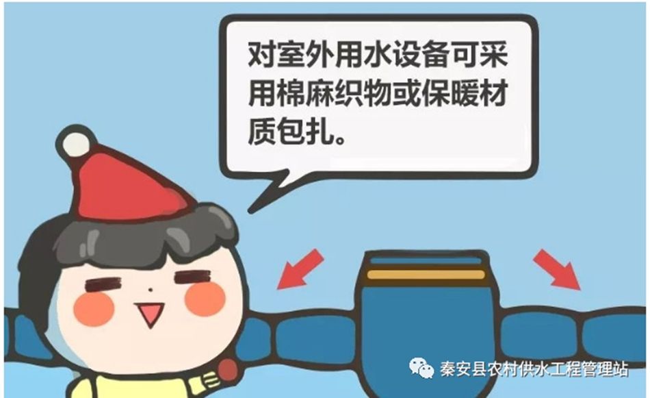 1、“穿衣戴帽”:室外水表井可以填充一些旧被褥、旧棉衣等保暖材料,水表井盖应关好,井盖上面覆盖塑料布等保暖措施,避免透风,防止水表冻坏;水龙头及立杆用塑料泡沫、锯末等保暖材料包裹严实,防止龙头及立杆冻阻。