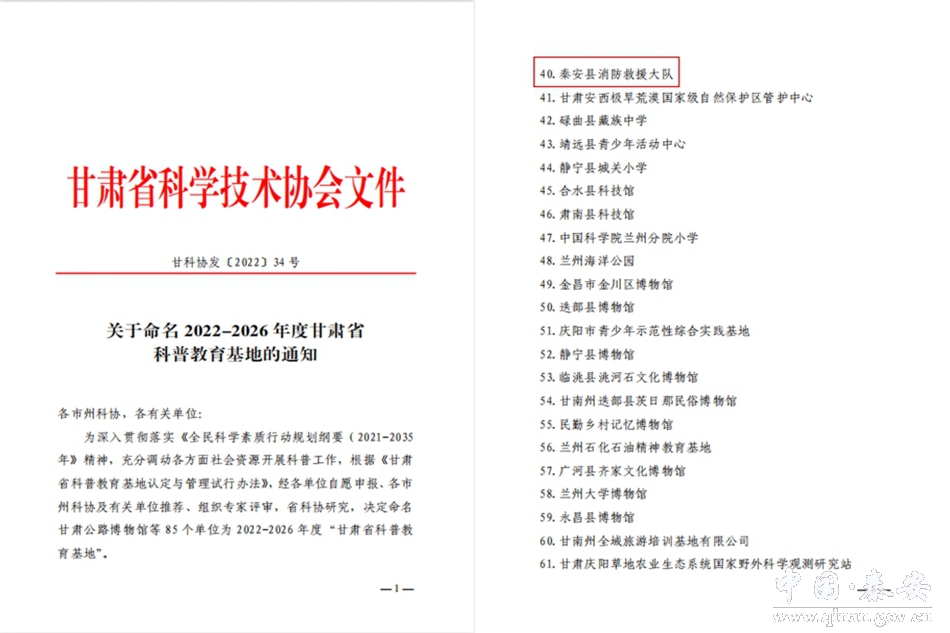 近日,甘肃省科学技术协会通过基层初选推荐和组织专家评审等方式,决定将符合条件的85个单位命名为2022—2026年度“甘肃省科普教育基地”,秦安县消防救援大队科普教育基地位列其中。