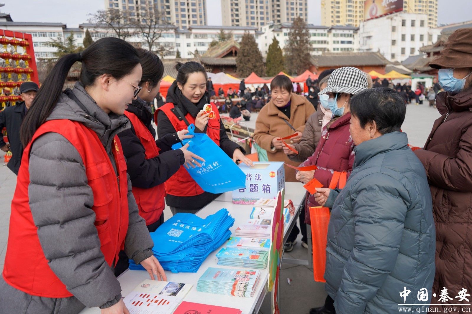 近日,秦安县司法局组织普法志愿者在兴国文化广场春节便民年货市场开展普法宣传活动,让群众在置办年货的同时,收获丰富的“法治年货”。