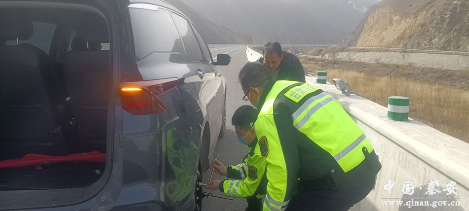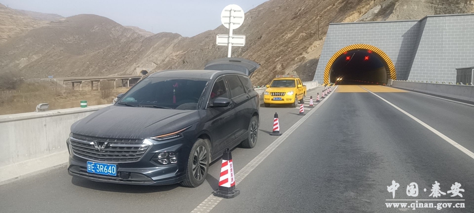 3月1日,平天高速公路天水收费所秦安隧道站巡检队李军、梁小军、姚斌对所辖隧道进行日常检查,巡查至上行线三阳川隧道出口时,发现前方应急车道有一辆车停留,司机茫然无助,焦急地向他们招手求援。经向司机了解,因为在刚刚行驶过程中,车辆左后轮爆胎,自己又不会换轮胎,所以求助。巡检队员立即停车查看现场,发现该车未打开应急灯和摆放危险警示牌,见此情景,考虑到现场安全的问题,立刻在现场摆放锥桶、设置安全警示牌做好安全防护措施。随后,拿出随车工具及备用轮胎进行更换,经过10多分钟的努力,轮胎更换完毕。