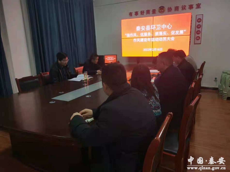 为全面贯彻落实中央和省、市、县委关于作风建设的部署要求, 2月18日,秦安县城乡环境卫生治理服务中心召开了“强作风、优服务、抓落实、促发展”作风建设年活动动员大会,全体干部职工参加。