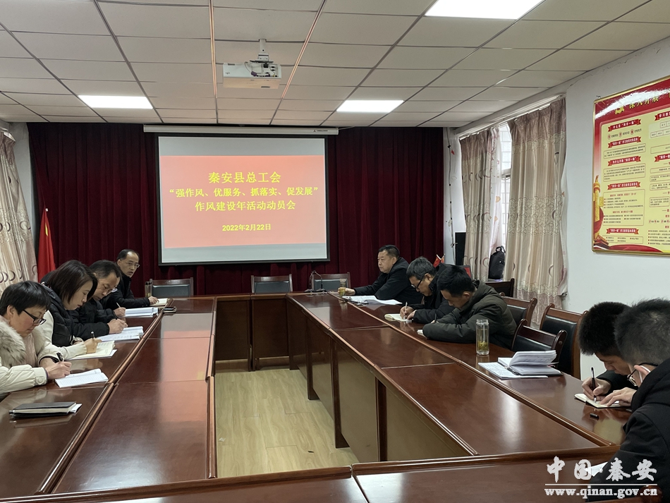 2月22日,秦安县总工会召开“强作风、优服务、抓落实、促发展”作风建设年活动动员大会。会议传达学习了全县作风建设年活动动员大会精神,宣读了《秦安县总工会开展作风建设年活动的实施方案》及领导小组成员名单,对县总工会机关开展作风建设年工作进行了安排部署。