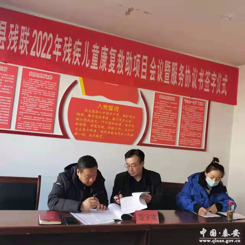 会后,宋爱宗分别与天水市407康复医院、兰州启聪聋儿语训中心、天水市妇幼保健院、天水大同康复医院、兰州市城关区爱之健脑瘫康复中心、兰州市七里河区鸣创融合康复中心、兰州市欣雨星儿童心理发展中心、兰州市新宝儿童特殊教育中心共8家定点残疾儿童康复机构负责人共同签订了《秦安县残疾人联合会2022年残疾儿童康复救助项目服务协议》。