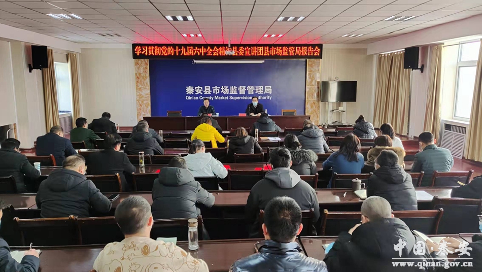 1月10日,学习贯彻党的十九届六中全会精神县委宣讲团在秦安县市场监管局举行专题报告会。县委宣讲团成员、县委党校讲师孟小平作宣讲报告。
