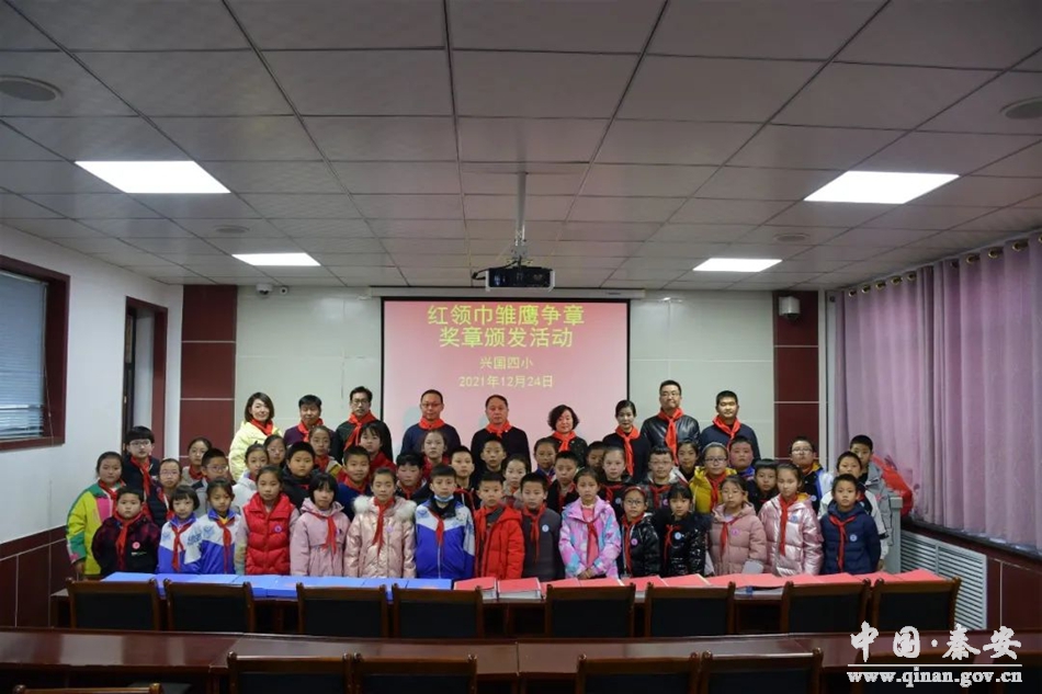 为贯彻落实共青团中央、教育部、全国少工委联合印发的《关于构建阶梯式成长激励体系增强少先队员光荣感的指导意见》文件精神,切实增强少先队员光荣感,依据《“红领巾奖章”实施办法》,兴国四小少先队自2021年3月起,规范开展“红领巾奖章”争章活动。 经过争章、考章等一系列活动,兴国四小于 2021年12月24日,在多功能室举行了热烈而庄严的“少年当自强,雏鹰勇争章”红领巾奖章颁发活动。