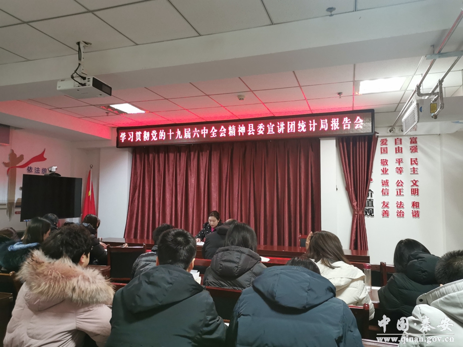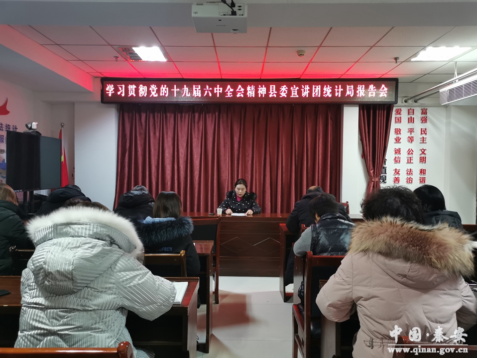 12月30日,学习贯彻党的十九届六中全会精神县委宣讲团宣讲报告会在秦安县统计局举行。报告会邀请县委宣讲团成员、县委党校助理讲师雒娟芳以《百年征程照初心,信念如磐终致远----党的十九届六中全会之〈决议〉解读》为题作专题报告。