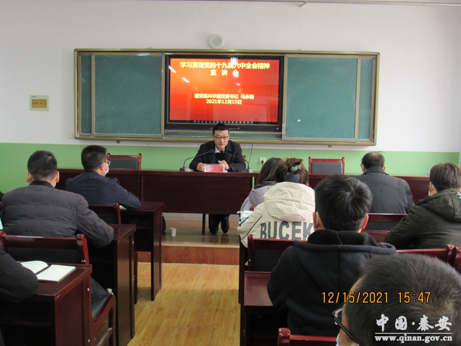 为深入学习领会好、贯彻落实好党的十九届六中全会、天水市第八次党代会和秦安县第十七次党代会精神,结合党史学习教育,全力推进党的理论教育进校园、进课堂、进头脑,努力谱写兴丰教育新篇章。12月15日,兴丰学区党总支举办党的十九届六中全会、天水市第八次党代会和秦安县第十七次党代会精神宣讲会,宣讲会由兴丰镇党委书记马永驰主讲。