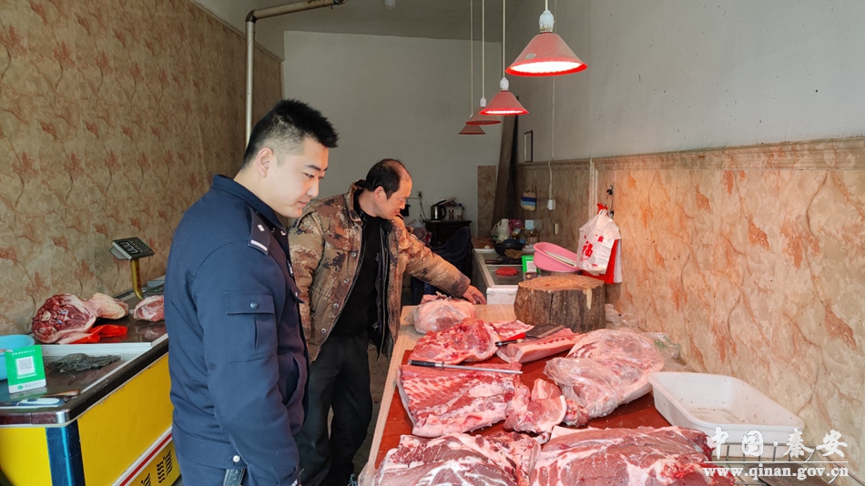 为防止未经检疫的猪肉流入市场,切实维护市场经营销售秩序,确保辖区销售猪肉质量和人民群众饮食安全,近日,秦安县公安局陇城派出所组织警力对辖区内销售猪肉的店铺、摊点进行突击检查。