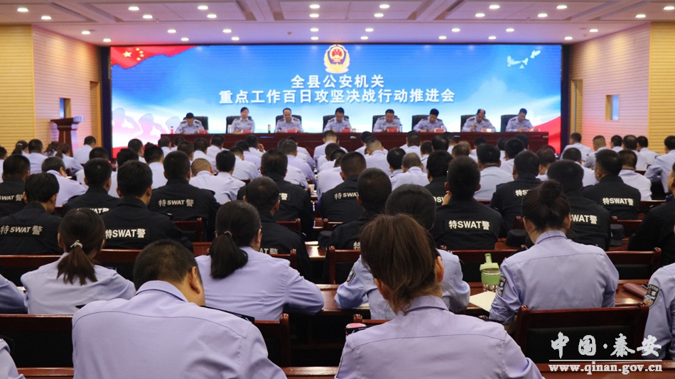 为认真贯彻落实省厅、市局重点工作百日攻坚决战行动动员部署会议精神,全面推动重点工作提质增效,9月24日,秦安县公安局召开全县公安机关重点工作百日攻坚决战行动推进会。会上宣读了《秦安县公安局重点工作百日攻坚决战行动方案》,对当前重点工作进行了安排,对国庆假期期间安保维稳工作进行了安排部署。秦安县政府副县长、县公安局党委书记、局长薛天胜参加会议并讲话。局在家党委班子成员,各警种部门和各派出所班子成员,机关全体民辅警参加了会议。