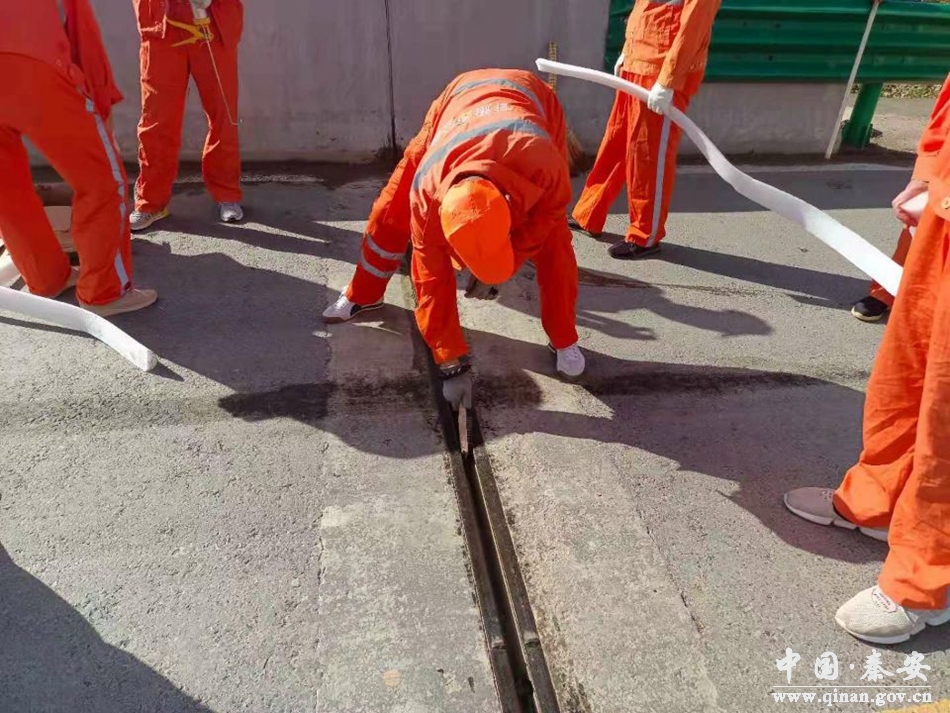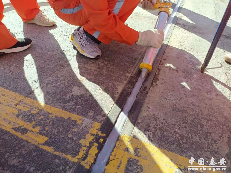 近日,秦安公路段组织专业人员在S207线杨家沟桥运用自流平高弹性嵌缝液体止水密封胶对该桥梁的伸缩缝进行维修处理,这也是秦安公路段首次采用该项新材料对桥梁进行维护,取得了良好的效果。