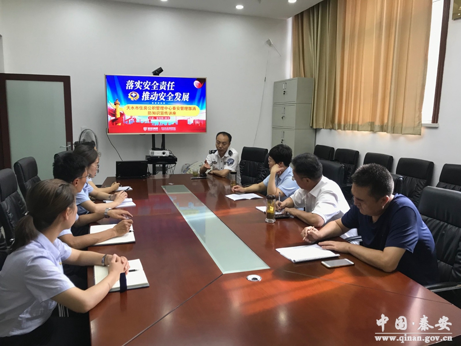 为提高天水市住房公积金管理中心秦安管理部工作人员的安全防范意识,掌握科学施救和自救方法,2021年7月20日,秦安管理部组织开展了以“落实安全责任、推动安全发展”为主题的消防知识专题讲座,政安消防教官雷明辉及管理部全体职工及银行驻厅人员参加。