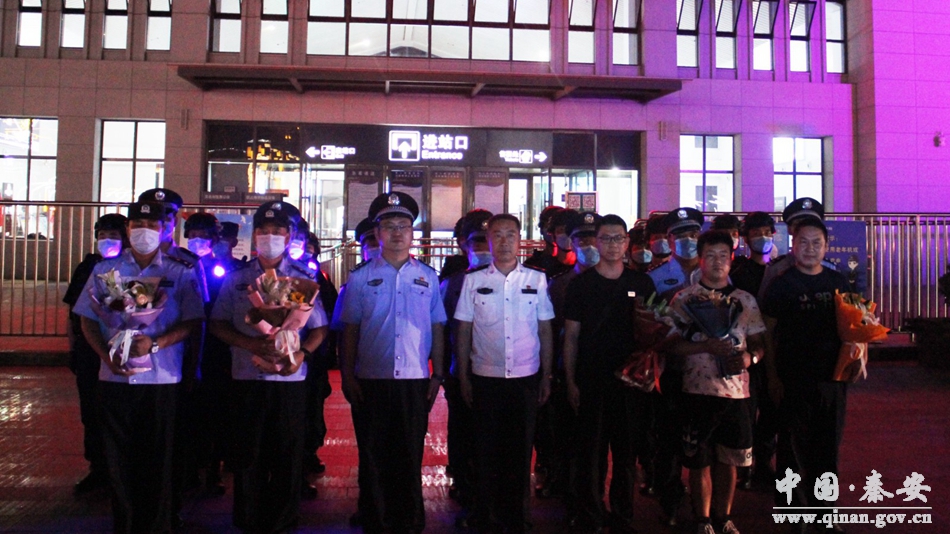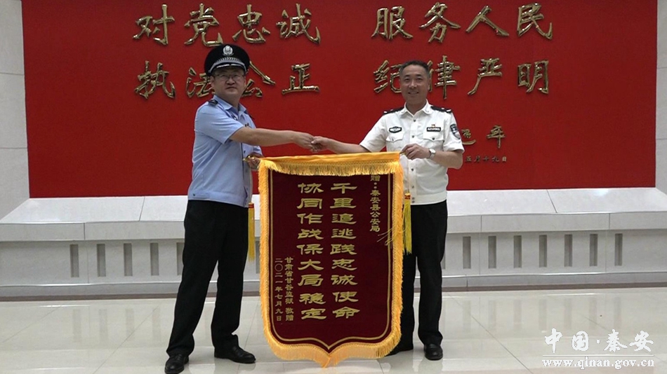 2021年7月9日晚,秦安县政府副县长、公安局党委书记、局长薛天胜,局党委委员、副局长王少舜,刑侦、特警等部门民警在秦安高铁站迎接专案组民警押解罪犯杜某斌凯旋归来。当晚,罪犯杜某斌在秦安特警的押解护卫下顺利移交给天水甘谷监狱,甘谷监狱为秦安县公安局敬献题为“千里追逃践忠诚使命、协同作战保大局稳定”的锦旗一面。专案组以实际行动生动诠释了秦安公安忠诚担当、攻坚克难、干则一流、战则必胜的优良品质和顽强作风。