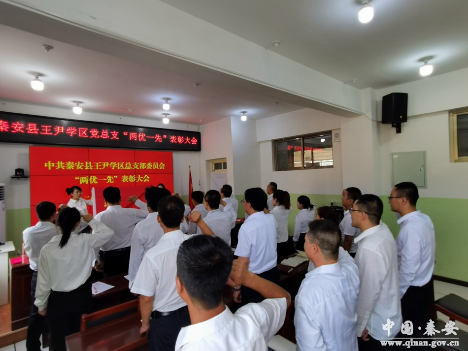 会议伊始,全体起立,奏唱国歌。随后,全体党员教师在王尹学区党建办主任付建国同志的带领下,面对鲜红的党旗庄严宣誓,表达了为共产主义事业奋斗终身的决心。