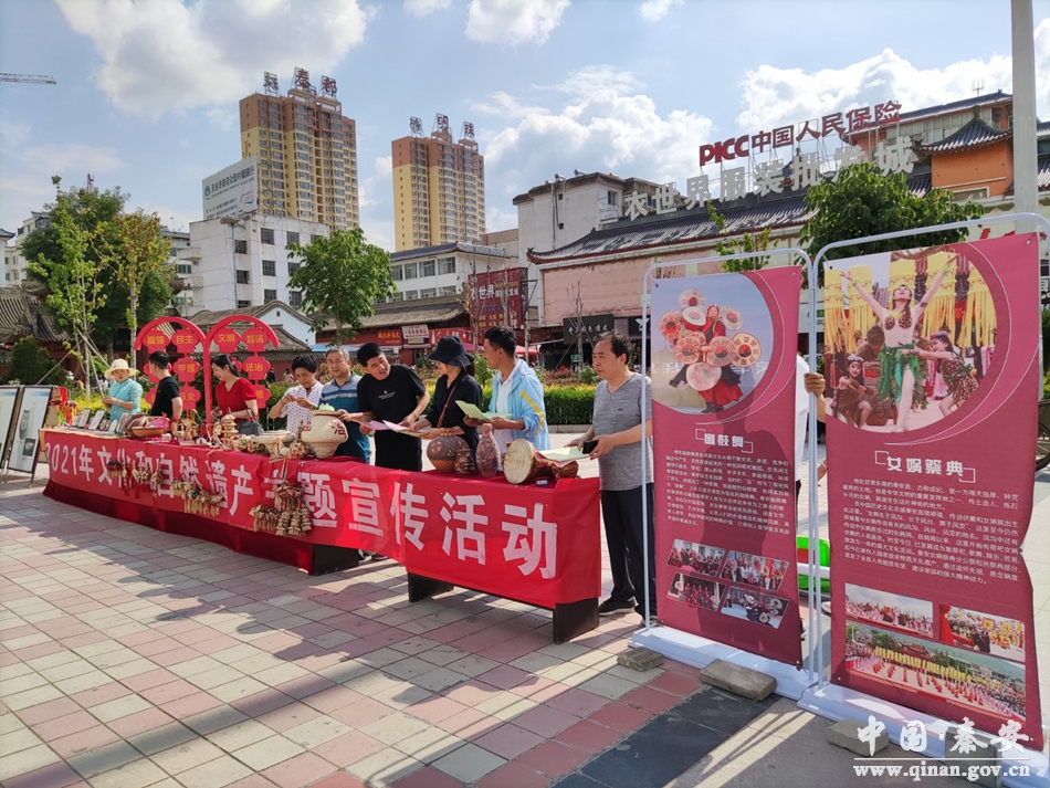 2021年“文化和自然遗产日”非遗宣传展示活动以“人民的非遗人民共享”为主题和宣传口号,现场共展出秦安县国家级非遗女娲祭典、秦安小曲,省级非遗羊皮扇鼓舞、秦安壳子棍等非遗宣传展板6块,展出县级非遗项目秦安剪纸、秦安麦秆编、彩陶等实物30余件,发放非遗法律法规宣传单500余份,悬挂宣传条幅、标语10余条,现场利用快手、抖音等新媒体宣传平台多方位进行了宣传。