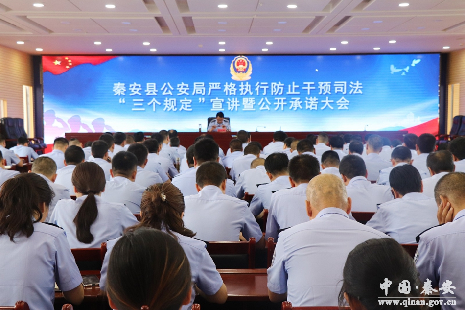 为进一步推动“三个规定”在全县公安机关的贯彻落实,坚决纠正、有效防止领导干部及其他内部人员干预、插手案件办理,6月11日,秦安县公安局召开严格执行防止干预司法“三个规定”宣讲暨公开承诺大会,秦安县政府副县长、县公安局党委书记、局长薛天胜参加会议并作宣讲。局党委班子成员、各派出所所长及机关全体民警参加会议。
