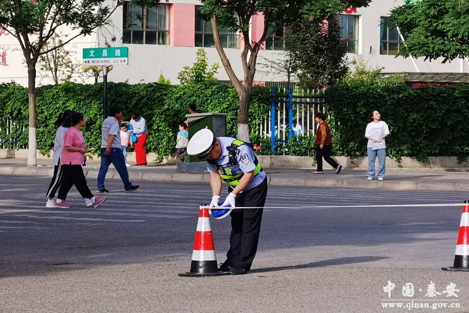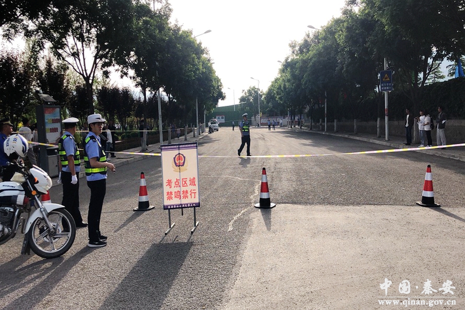 期间,秦安县公安局交警大队在辖区考点周围道路增派警力,执勤民辅警提前到岗到位,在考点周边100米内设立禁止通行鸣号标牌,以警戒线清楚划明管制区域。同时,大队还加大对考点周边主干路段巡查力度,查纠各类交通违法行为,消除一切交通安全隐患,保障考试的顺利进行。