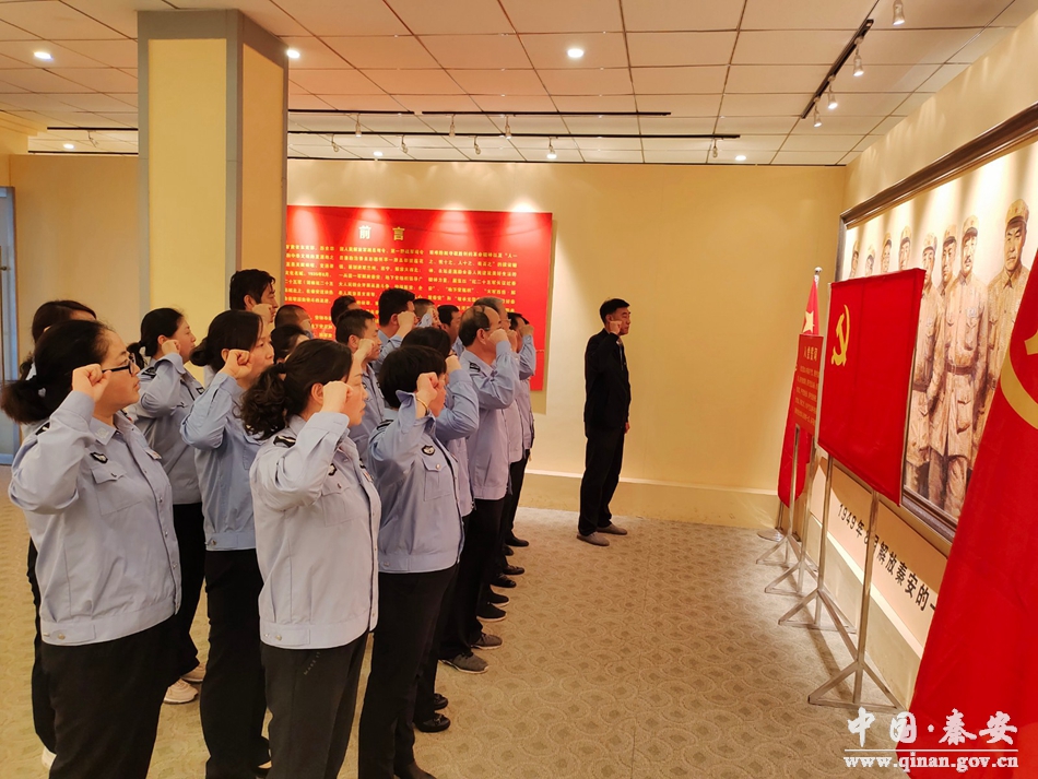 在秦安县解放纪念馆,全体党员列队面向党旗,举起右拳,重温入党誓词,表达了对党的忠诚和为共产主义事业奋斗终身的决心。全体人员在讲解员的带领下,重温了红军第二十五军的长征路,认真聆听革命斗争史和革命先辈光荣事迹的介绍。在参观过程中,大家一路认真听、用心记,在珍贵图片资料和实物前,不时驻足观看讨论,通过一个个感人的故事,一张张珍贵的图片,一件件实物,在历史场景中思索和重温党的光辉历史,深刻感悟红色文化精神,表达了对党的忠诚和为共产主义事业奋斗终身的决心。
