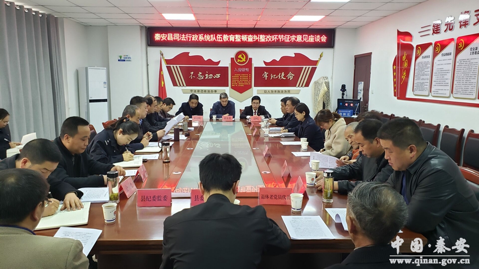 为深入推进司法行政系统队伍教育整顿查纠整改工作走深走实,开门搞好教育整顿。4月21日,秦安县司法局召开全县司法行政系统队伍教育整顿查纠整改环节征求意见座谈会,会议邀请县人大代表、县政协委员、服务对象代表、群众代表、退休老党员代表、县委组织部、县纪委监委、各政法单位代表共14人座谈,秦安县司法局领导班子成员、公证律师负责人、局机关各股室负责人共计29人参加座谈会。