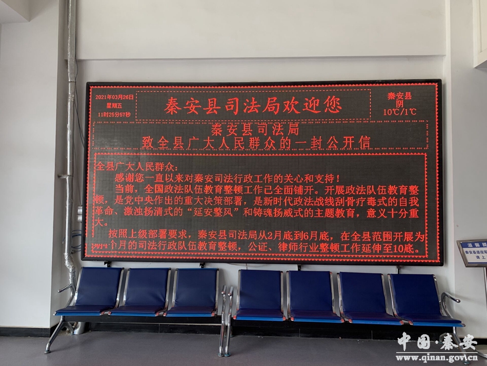 在县司法局机关大院和17个基层司法所院内悬挂队伍教育整顿宣传横幅19条,制作队伍教育整顿宣传版面和宣传专栏30个,充分利用室内外LED电子显示屏播放教育整顿宣传标语,将开展司法行政队伍教育整顿的意义、目的、内容和任务,多角度、全方位的展示在了公众面前,使人民群众更加直观的了解到司法行政系统“开门整顿”的决心,同时在县公共法律服务中心大厅、县司法局大门口宣传栏等醒目位置播放和张贴队伍教育整顿“致全县人民的一封信”向社会各界征求意见和建议,迅速掀起宣传热潮。