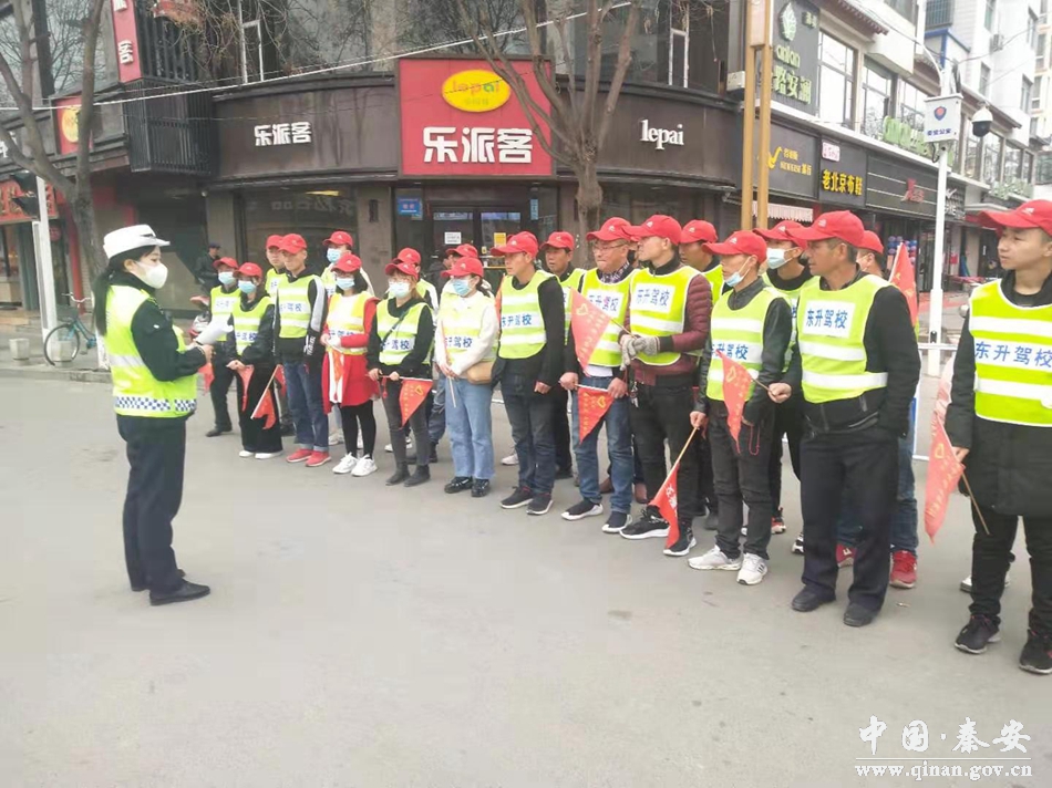 为进一步强化驾校交通安全宣传力度,提升准驾新人交通安全意识、法治意识、文明意识。3月8日,秦安县公安局交警大队组织辖区各驾校学员开展文明交通志愿“大劝导”活动。