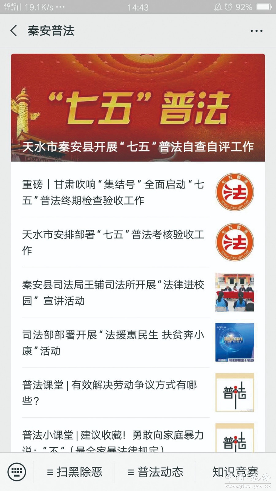 着力打造新媒体立体化网络阵地。充分发挥新媒体用户数量多、传播快、形式灵活优势,以“互联网+法治宣传模式”弥补传统法治宣传教育工作中存在的不足,提升法治宣传效果,努力将法治宣传教育与灵活多样的新媒体平台相结合,积极拓展互联网、政府门户网、106政信通手机短信、“秦安普法”微信公众号、秦安司法微博号、秦安司法头条号,在秦安县政府网站设立了政法综治频道法治宣传教育专栏等宣传阵地,公众可以在互联网上和手机上随时随地了解到常用的法律法规知识,实现了“指尖上的微普法”。投入使用“小律·智慧普法与公共法律服务触摸一体机”,方便公共法律服务中心附近群众根据各自需求进行法律知识快速查询,让老百姓享受到“一站式”公共法律服务红利,成为基层群众学法用法、寻求法律帮助的好助手,实现了普法载体由传统的“单一灌输”向“双向互动”的转变。