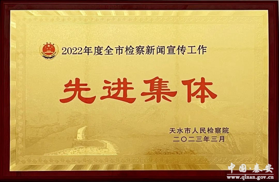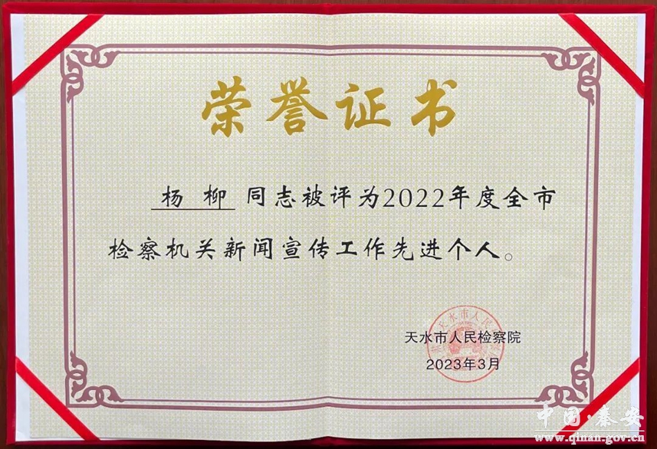 3月31日,全市检察机关宣传思想工作会议召开。会议对2022年全市检察机关宣传工作先进集体和个人进行了表彰,秦安县人民检察院政治部被评为“2022年度全市检察新闻宣传先进集体”,杨柳被评为“全市检察机关新闻宣传工作先进个人”。