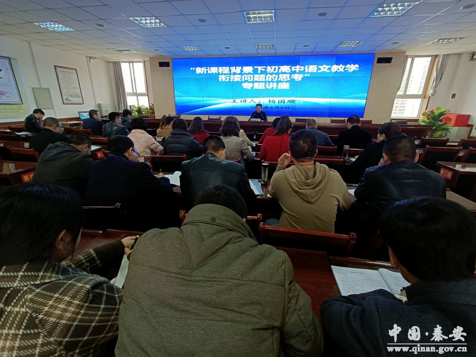 在专题讲座中,秦安一中正高级教师杨国顺从语文教材的双重价值、语文教学价值的未定性、语文教学内容的生成与生成者、语文教材的内容、“教教材”与“用教材教”、用好文本资源,进行有效对话六个方面进行了讲解。听了杨国顺的专题讲座,每一位参会者对初高中语文教学衔接教学有了更清晰的认识,进一步激励了他们探究初高中语文衔接教学的策略与方法,增进创建优质课堂教学的决心与信心,推动中片区语文教学协同发展。