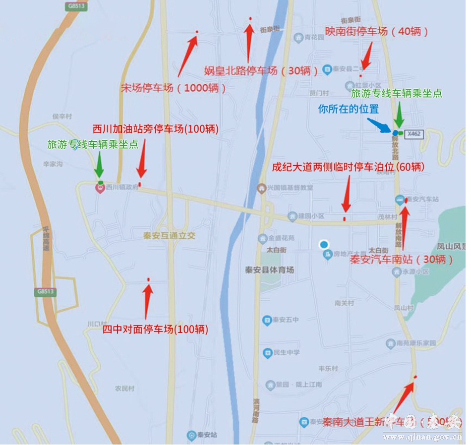 节会期间,解放路(飞天文化酒店十字路口)-刘坪镇秦洼村(果品交易市场)路段交通管制,全路段禁止停车,请广大游客乘坐旅游班线车游园赏花。秦安县城内设有临时停车泊位(附下)及智慧停车场(详情请关注“秦智通”公众号或“秦智通”小程序),请广大群众就近选择临时停车泊位(附下)及智慧停车场有序停放。