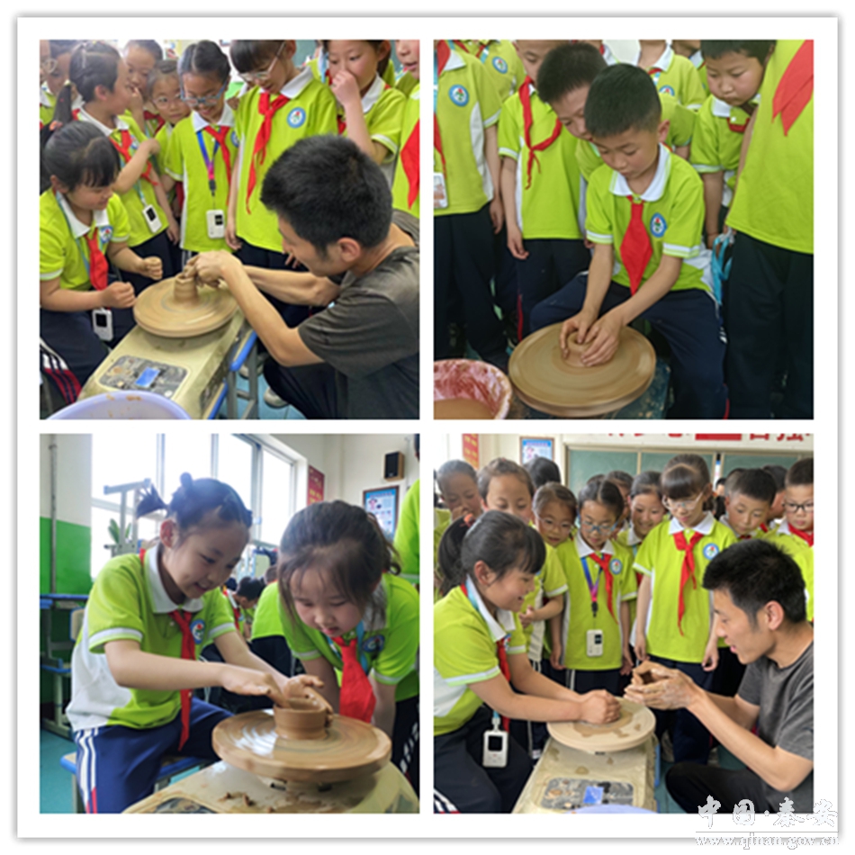 随后,秦安县博物馆特邀的天水市非物质文化遗产传承人康晓刚为孩子们一边讲解一边示范陶器成型过程。当一块陶土在康老师的手里通过轮盘成为一件精美的器物时,孩子们惊叹不已。在康老师的指导下,孩子们开始亲自体验陶艺制作,他们热情高涨,精心制作,活动在紧张而快乐的氛围中进行。