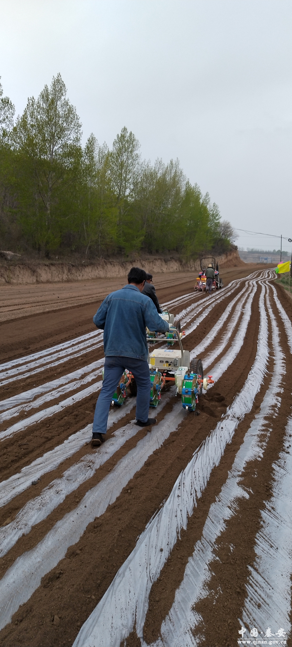 本次演示会采取现场观摩、技术人员现场授课的方式,共展示了5台旋耕施肥覆膜点播一体机、12台玉米播种机、2台中小型联合收割机、1台植保无人机、1台残膜回收机等机具。通过技术人员的讲解和机具直观的演示提高了群众对玉米一体化播种机和电动播种机的性能、操作要点的了解和技术的掌握。演示采用玉米全程机械化与双垄沟播相结合的方式,一膜三行的播种模式,行距40cm,株距27cm,亩种植株数5900株,播深一致,株行距一致,有利于出苗,为今后的丰产打好了基础。