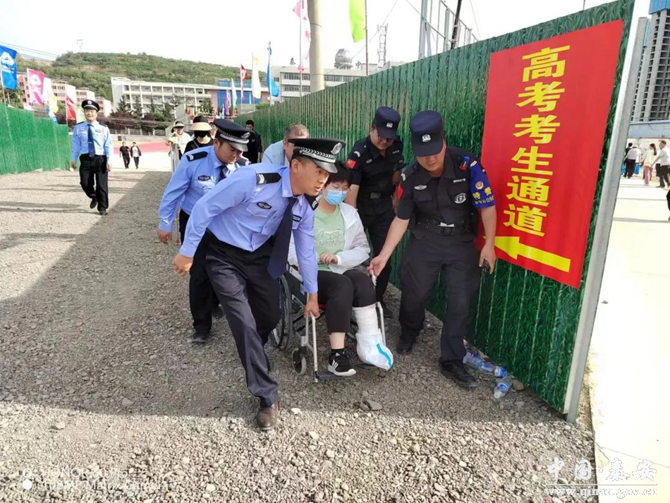 6月7日18时许,秦安县公安局民警在秦安县第一中学考点执勤时,发现人群中有一考生父亲推着坐在轮椅上的女孩走出了考点,在砂石路面上该考生父亲艰难地推着轮椅,尽管用尽了力气,但轮椅还是挪动缓慢,见状后,考点执勤民辅警立即上前帮助该考生父亲将其推出砂石路面。