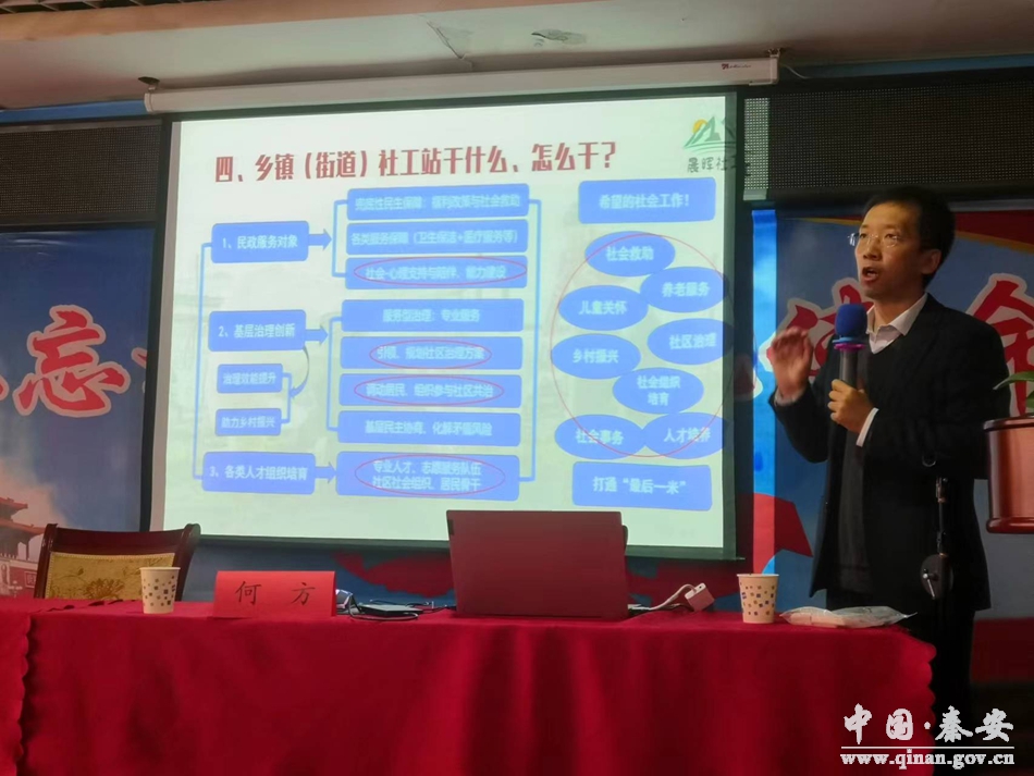 讲座由兰州市德邻社会工作服务中心理事长、天祝县晨晖社会工作服务中心理事长、西北师范大学社会工作硕士专业学位研究生实践指导教师何方主讲,围绕“社工是什么”,从“社工的概念”“社工的工作方法”“社工的工作领域”等几个方面结合实际案例及视频,深入浅出地为如何做好社会工作指明了方向,进一步拓展了基层社工视野,提升了社工讲好基层故事、展示基层亮点、传播正能量的能力水平,加强了社工实践能力水平。