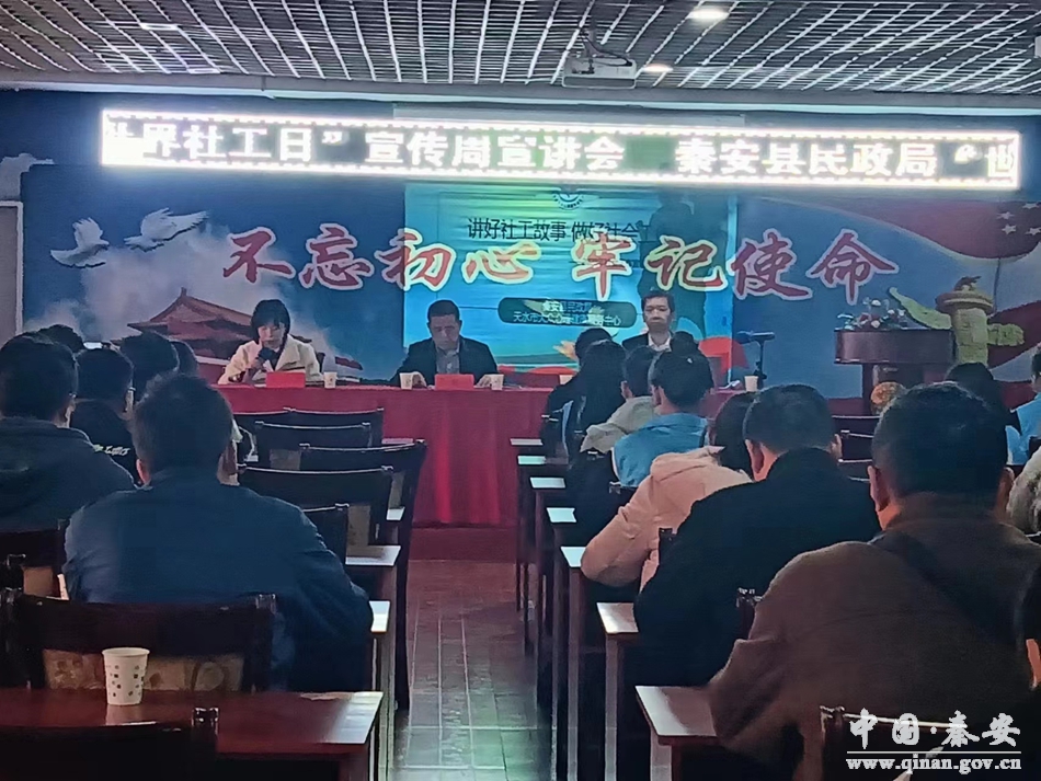 为弘扬社会工作专业精神,传播社会工作知识,充分展示社工风采,进一步提升全县社工站驻站社工的服务能力和工作水平,3月22日,秦安县民政局举办2023年“世界社工日宣传周”系列活动—“讲好社工故事 做好社会工作”社工知识专题讲座暨“党建引领促发展 社工聚力显初心”主题演讲比赛。各镇民政助理员,县民政局相关股室工作人员,9个镇的驻站社工,相关社会组织工作人员,社会工作者及报考社会工作职业资格考试的人员参加本次活动。