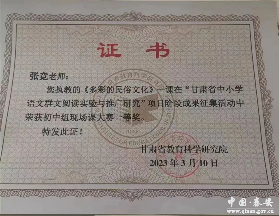 为进一步提升语文教师的专业素养,优化教学方式,激发学生阅读兴趣、提升学生的阅读能力,近日,桥南中学语文教师张竞在兰州市外国语学院参加了由甘肃省教育科学研究院主办的2022年“甘肃省中小学群文阅读实验与推广研究”现场课征集展示活动,她执教的《多彩的民俗文化》一课在比赛中喜获初中组一等奖。