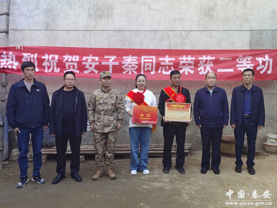 伴随着锣鼓喧天、鞭炮齐鸣的热闹声,在家乡父老乡亲们的见证下,相关领导为现役军人安子秦家属披上了“一人立功、全家光荣”的绶带,佩戴了大红花,将二等功喜报交到安子秦家属手中,并现场合影留念。
