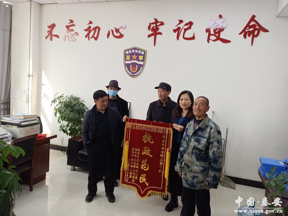 “感谢你们为我们要回了工资,辛苦你们了。”3月8日早晨刚上班,6名农民工就将一面写有 “执政为民”的锦旗送至秦安县劳动保障监察中队,表达了对监察中队帮助他们讨回10.504万元工资的真挚感谢。