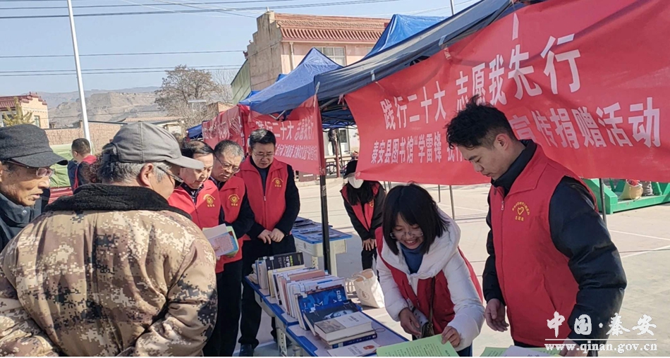 3月5日上午,秦安县“践行二十大,志愿我先行”学雷锋志愿服务主题实践活动暨“学雷锋我行动”文明实践志愿服务活动在陇城镇西关村举行。秦安县文旅局组织文化馆、图书馆等部门组成志愿服务队参加活动,分别开展了“红色文艺轻骑兵”惠民演出、“书香秦安”图书宣传捐赠,文明旅游宣传推介、文物和文化遗产保护宣传等活动。